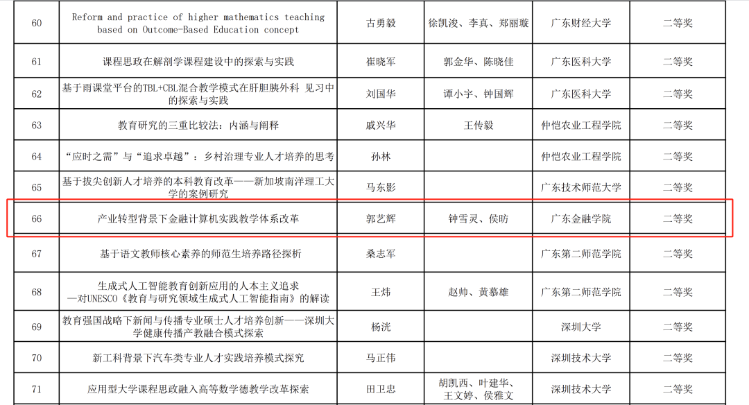 近日,广东省高等教育学会公布了第三届高等教育研究优秀成果奖获奖名单。此次评奖一等奖不超过参评成果的10%,二等奖不超过15%,三等奖不超过25%。公司郭艺辉、钟雪灵、侯昉三位老师合作的论文《产业转型背景下金融计算机实践教学体系改革》获评第三届高等教育研究优秀成果奖二等奖一项。