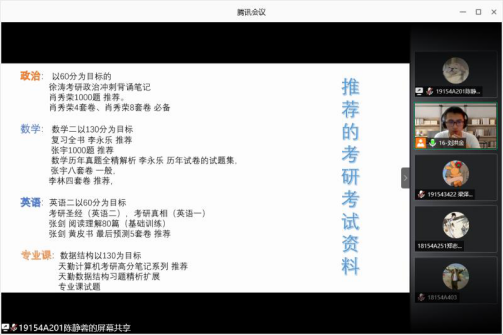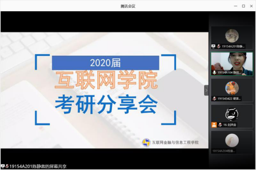 6月27日,公司在腾讯会议平台举办考研分享交流会。公司党总支副书记丘志君、辅导员钟培权、辅导员陈兴出席了会议,2020届考研成功优秀毕业生陈彩凤、蔡浩锋、刘洪金、莫咏莹和李浩彬应邀与80多名师弟师妹分享交流考研经验和方法,会议由陈欣瑄同学主持。