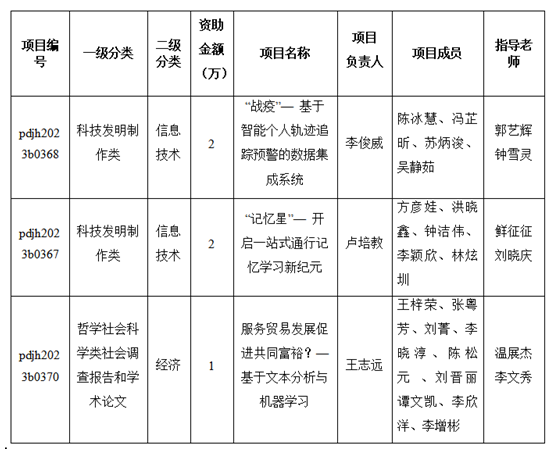 近日,团省委公布了2023年广东省科技创新战略专项资金(老员工“攀登计划”科技创新培育)资助立项项目名单。全校共9个,其中包括公司3个项目获得立项资助。公司3个项目分别为:李俊威团队《“战疫”—基于智能个人轨迹追踪预警的数据集成系统》、卢培教团队《“记忆星”—开启一站式通行记忆学习新纪元》、王志远团队《服务贸易发展促进共同富裕?—基于文本分析与机器学习》。3个项目共获专项资助资金5万元,各团队成员及立项详细信息见表1。
