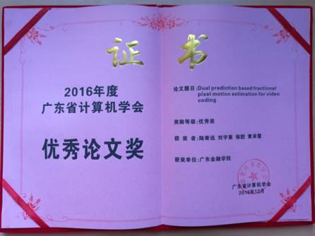 2016年12月7日,广东省计算机学会公布了2016年度优秀论文评选结果,经过申报、推荐及专家组综合评审等环节,评选出4篇一等奖论文,6篇二等奖论文,9篇三等奖论文以及7篇优秀奖论文。伟德国际victor1946陆寄远、刘宇熹、侯昉和黄承慧四位老师合作发表的论文“Dual prediction based fractional pixel motion estimation for video coding”获优秀奖。