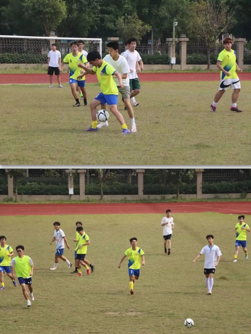 下午两点,身着白色队服的清远校区队员与身着绿色队服的广州校本部队员如约而至,在操场上进行热身活动。随着裁判员的一声哨响,绿茵场上的队员们开始走动、传球、运球、过人、射门,双方的动作行云流水。队员们灵活应变,默契地配合,精彩的射门吸引观众的眼球,上演了一场精彩的攻防战,最终双方队员以2:2的比分结束本次交流赛。